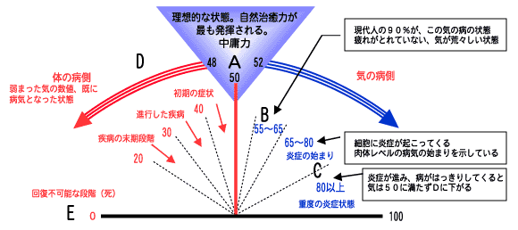 この「50」の抵抗値は、自然治癒力が最も発揮されやすい状態を示し、55以上は気の病、47以下は身体の病であることが解明されている。