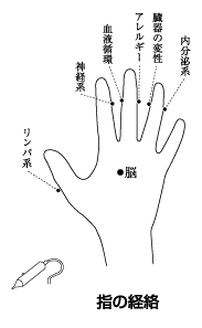 医師ではない我々は、身体のどこに問題があるかを鑑定するのではなく、身体全体を自然治癒力に溢れたエネルギー体にすることを目的としているので、五臓六腑などは測らずに、右図の7ヵ所だけにしている。